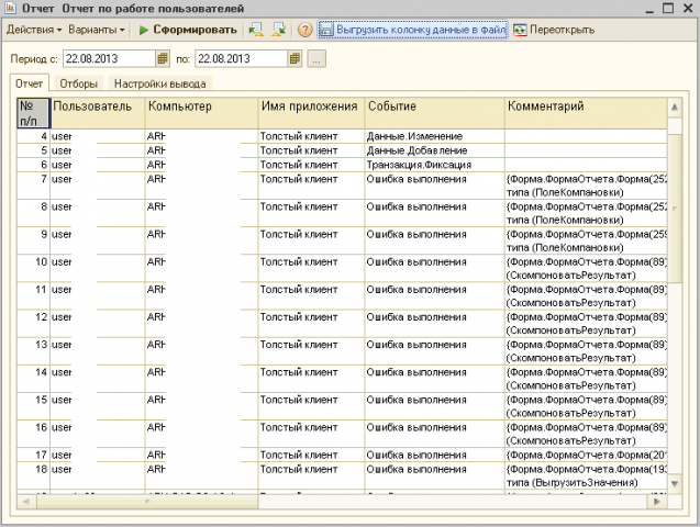 Журнал регистрации на основе класса 1С++ "ПоставщикДанныхЖурналРегистрации" Обработка существенно облегчает жизнь, т.к. отборы работают быстрее, чем в штатном ЖР. Кроме того, при просмотре журнала очень удобно использовать быстрый фильтр по нескольким значениям (например по пользователю и событию, типа «Ввод нового документа»)….