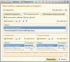 С помощью этой обработки можно выполнить тонкую настройку регистрации событий Доступа/Отказа в доступе в журнале регистрации без программирования. Примечание В полях регистрации можно задавать альтернативы полей (см. документацию: «Руководство разработчика», разд.21.3 «Управление регистрацией событий»). Для этого надо перечислить их через…