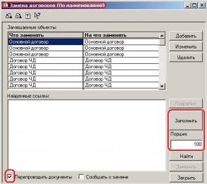 Обработка замены дублей в справочнике "Договоры" (На основе REPLVAL) В стандартную обработку «REPLVAL» добавлена маленькая процедурка, позволяющая автоматически заполнить «табличку элементов для замены» договорами контрагентов, в качестве заменяющего выступает элемент с меньшим кодом, заменяемые — все остальные договора контрагента совпадающие…