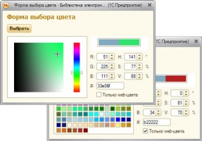 Форма выбора цвета — альтернатива стандартному диалогу выбора цвета (тонкий клиент, толстый клиент, обычное приложение). Позволяет выбрать как поименованный цвет, так и более точный по шкале. Форма выбора цвета полностью написана на javascript мной самим без каких либо сторонних библиотек….