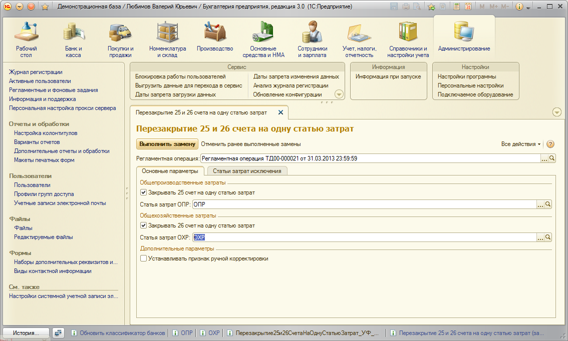 В обработке нужно указать уже ранее выполненную регламентную операцию закрытия счетов 20, 23, 25, 26 и статью затрат, которую необходимо проставить. Так же можно указать обработке, чтобы она поставила признак ручного редактирования проводок документа, но последующее перезакрытие этой регламентной операции будет несколько неудобным, так как придется открыть проводки документа и снять флажок ручной корректировки проводок.
