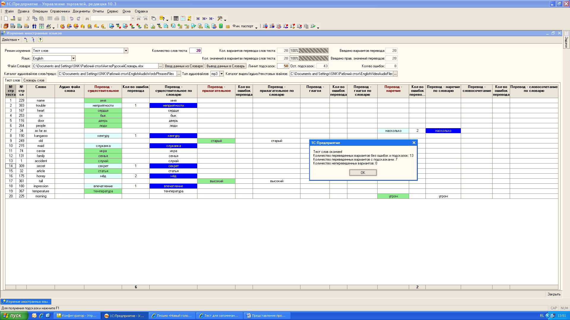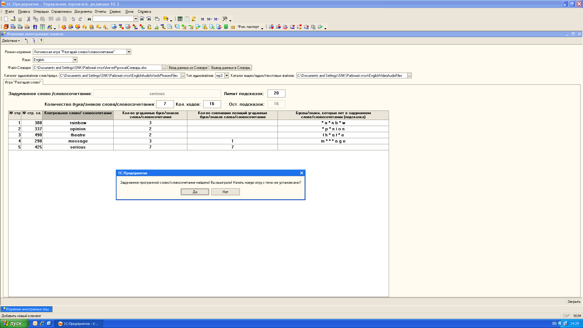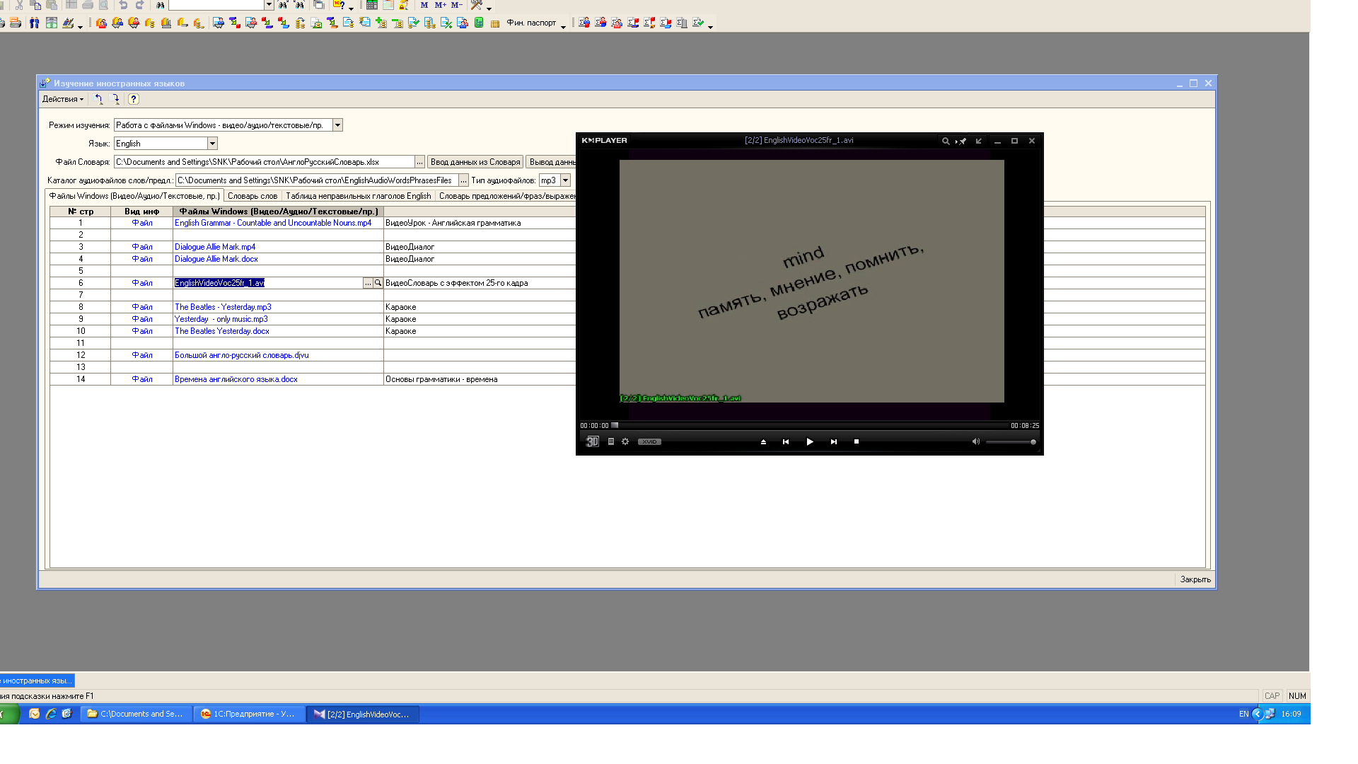 Служит для закрепления полученных знаний соответствующего иностранного языка по п.1 через их самостоятельное заполнение. Системно Словарь слов разбит на варианты перевода слова как существительного, как прилагательного, как глагола, как наречия и как словосочетания с различными значениями перевода для каждого варианта. Различные значения перевода слов необходимо разделять “; “ (точка с запятой + пробел), значения перевода предложений, фраз, выражений – “ /” (пробел + правый флэш). Для просушивания слов/предложений/фраз/ выражений необходим набор аудиофайлов (оптимально – самостоятельная нарезка при помощи любого аудиоредактора) с указанием каталога их хранения в соответствующем реквизите формы обработки. Для выбора аудиофайла из каталога используется кнопка «выбор», для открытия – кнопка «открыть» соответствующей строки столбца аудиофайлов таблиц Словарей. Для English аудиофайл может полностью соответствовать слову или предложению. Например, для слова drink – drink.mp3(aac, wav,…), для выражения Are you from London? — AreYouFromLondon.mp3. Поэтому для English в этом случае для прослушивания слова/предложения/фразы/выражения можно использовать просто кнопку «открыть» соответствующего строки столбца слова/предложения/… Архивирование заполненных Словарей и информации п.1 – файл Excel (его необходимо указать в соответствующем реквизите формы обработки).