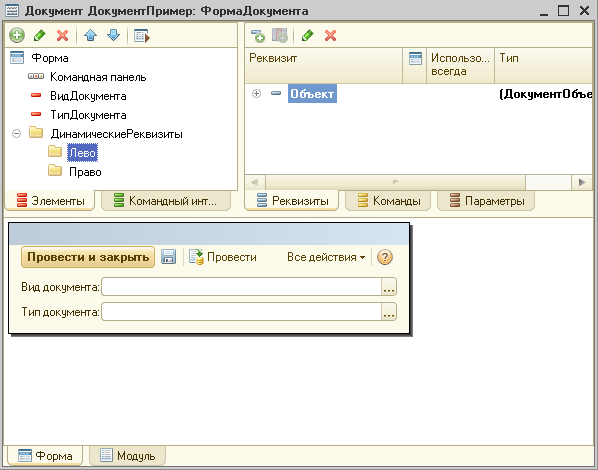 Для демонстрации примера создадим документ «ДокументПример» с реквизитами, хранящими вид и тип документа (о типе реквизитов см. выше). На форме документа добавим группу «ДинамическиеРеквизиты» с входящими в него группами формы «Лево» и «Право». Последнее необходимо, чтобы реквизиты на форме отображались в две колонки.