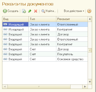 Состав реквизитов настраивается в регистре сведений. В примере регистр называется «СоставРеквизитовДокументов» и состоит из трех измерений: «Вид», «Тип», «Реквизит». Тип измерения «Реквизит» — «ПланВидовХарактеристикСсылка.СоставРеквизитов». Структура регистра не позволит к одному документу привязать один реквизит несколько раз. Пример настройки состава реквизитов документа приведен ниже.