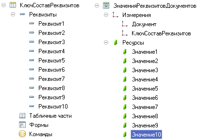 Ускорить работу механизма можно, если сохранять состав реквизитов в отдельной таблице для каждого документа (некое подобие ключей аналитики). Тогда мы можем в регистр «ЗначенияРеквизитовДокументов» записывать более рациональным способом.. Изменим структуру регистра таким образом, чтобы в первое измерения записывать ссылку на документ, во второе ключ состава реквизитов в документе, а в соответствующие ресурсы значения реквизитов в порядке, аналогичном порядку ключа состава в измерении. Этот подход ускорит запросы получения данных из таблицы регистра, поскольку для каждого документа будет одна запись в регистре.
