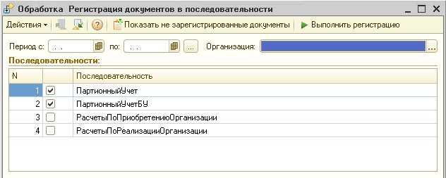 - Регистрация документов в резервной базе в восстанавливаемых последовательностях. Проблема в том, что при загрузке документов в резервную базу, эти документы не регистрируются в последовательностях резервной базы. И при запуске процедуры восстановления последовательности они будут попросту пропущены. Используется обработка Регистрация документов в последовательности. Правда мне пришлось её незначительно модифицировать под особенности ордерной схемы в УПП.