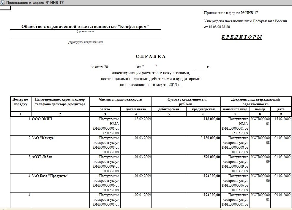 Печатная форма "Приложение к форме ИНВ 17" дебиторы и кредиторы в разных печатных формах.