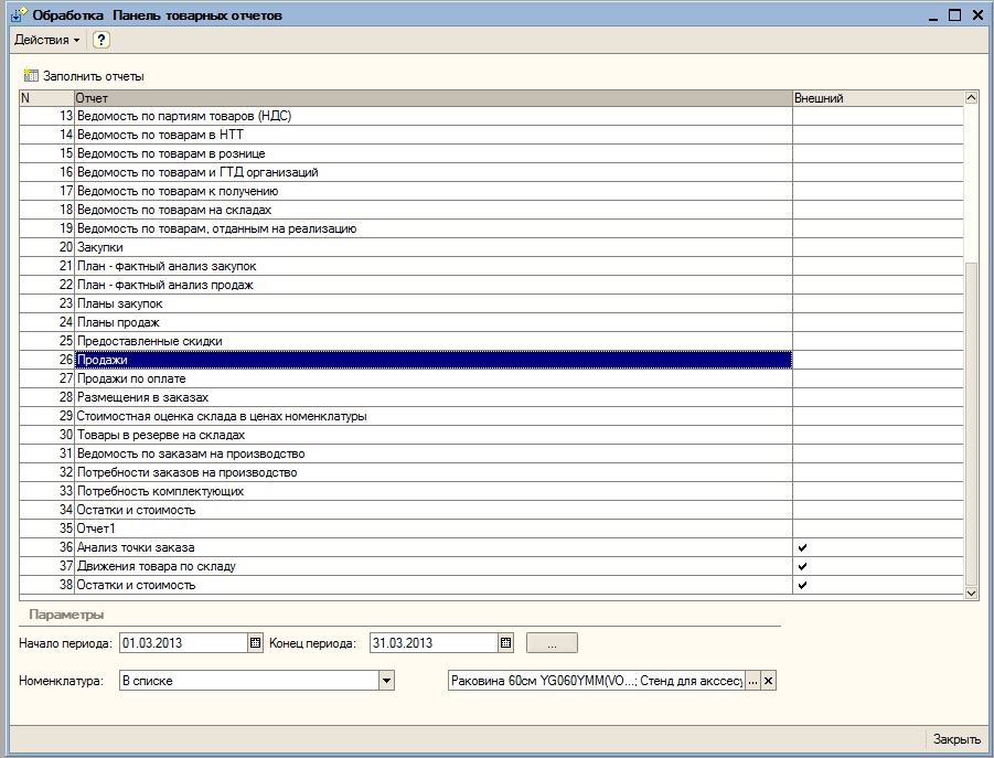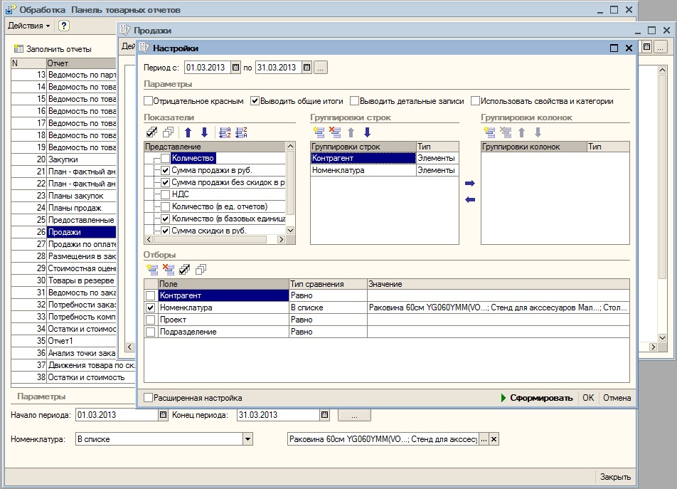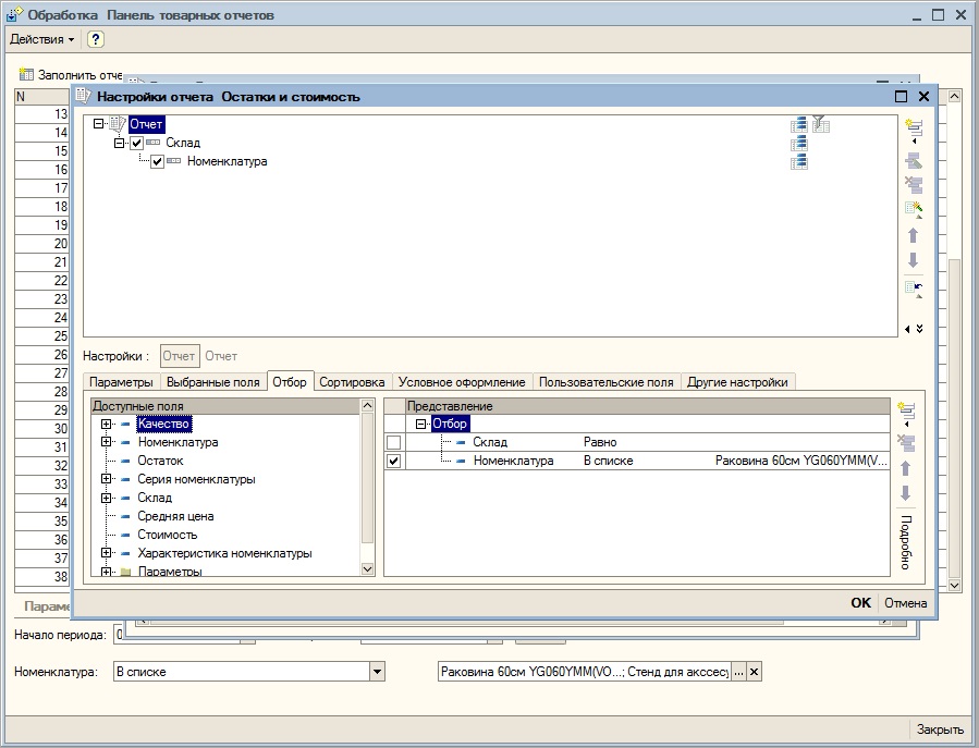 у отчета предопределенного добавленного отбора по полю "Номенклатура". В окне обработки задаются период и параметры отбора номенклатуры, чтобы затем открывать отчеты с указанными параметрами.