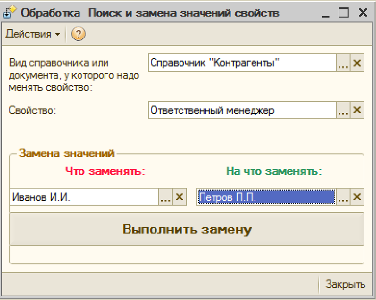 Заменяет все вхождения одного значения на другое у указанного вида объектов, указанного свойства