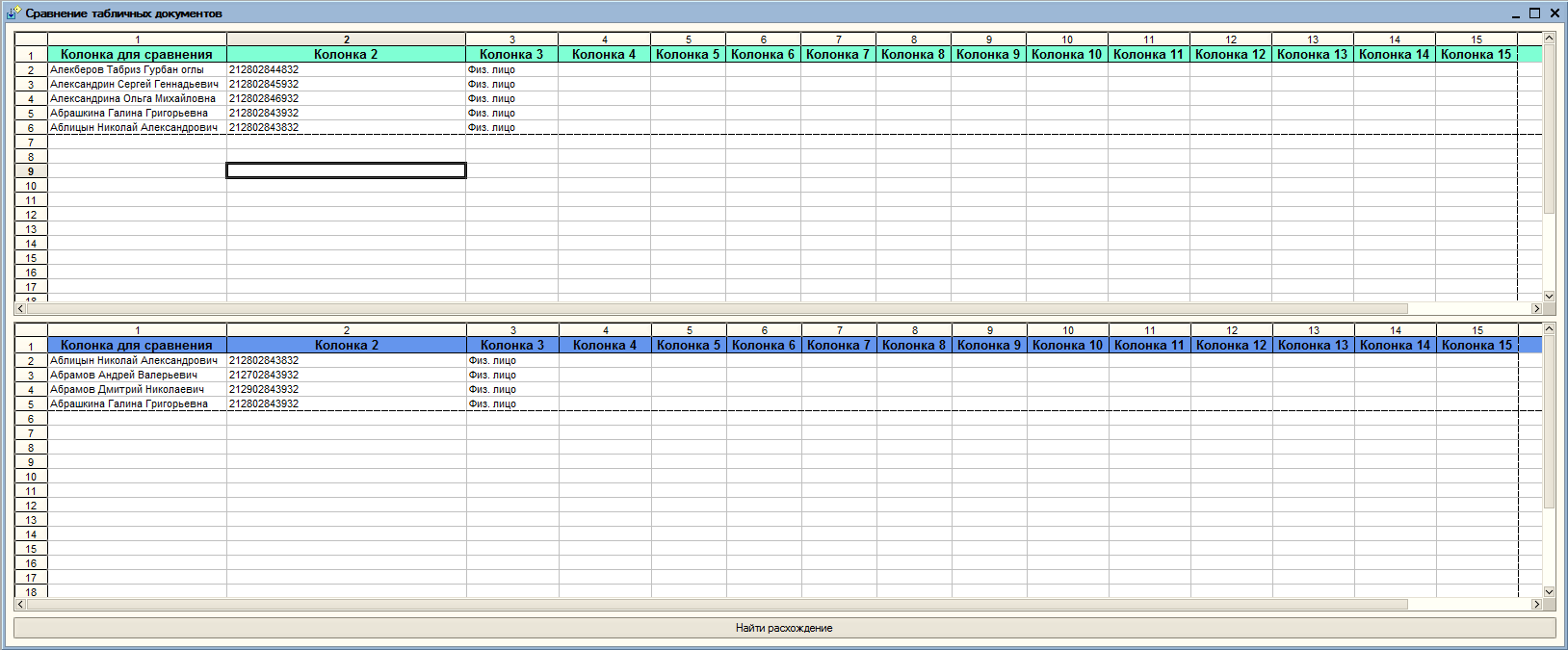 Итогом сравнения будут два табличных документа: в первом будут строки, которые присутствуют в верхней таблице, но отсутствуют в нижней таблице, во втором будут строки, которые присутствуют в нижней таблице, но отсутствуют в верхней таблице.