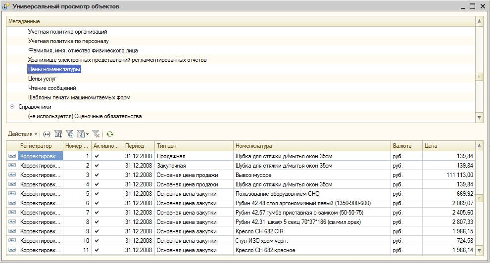 При выделении объекта в дереве значений, в нижней табличной части устанавливается тип «Список» (выбранного объекта). Отображает: содержимое регистров, справочники, документы и т.д.