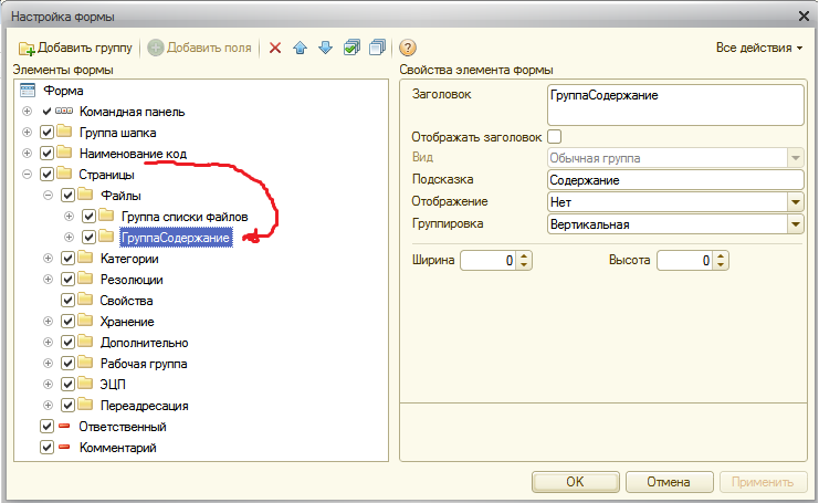 Далее переносим мышкой группу «ГруппаСодержание» в указанное место
