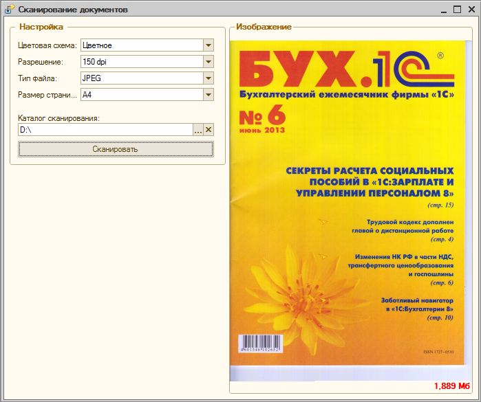 Сканировали бы и раньше через внешнюю компоненту TWINE, но коллегам захотелось сканровать в одну кнопку, с заданными параметрами по умолчанию. В результате изучения темы была создана внешняя обработка для сканирования средствами Windows Image Acquisition.
