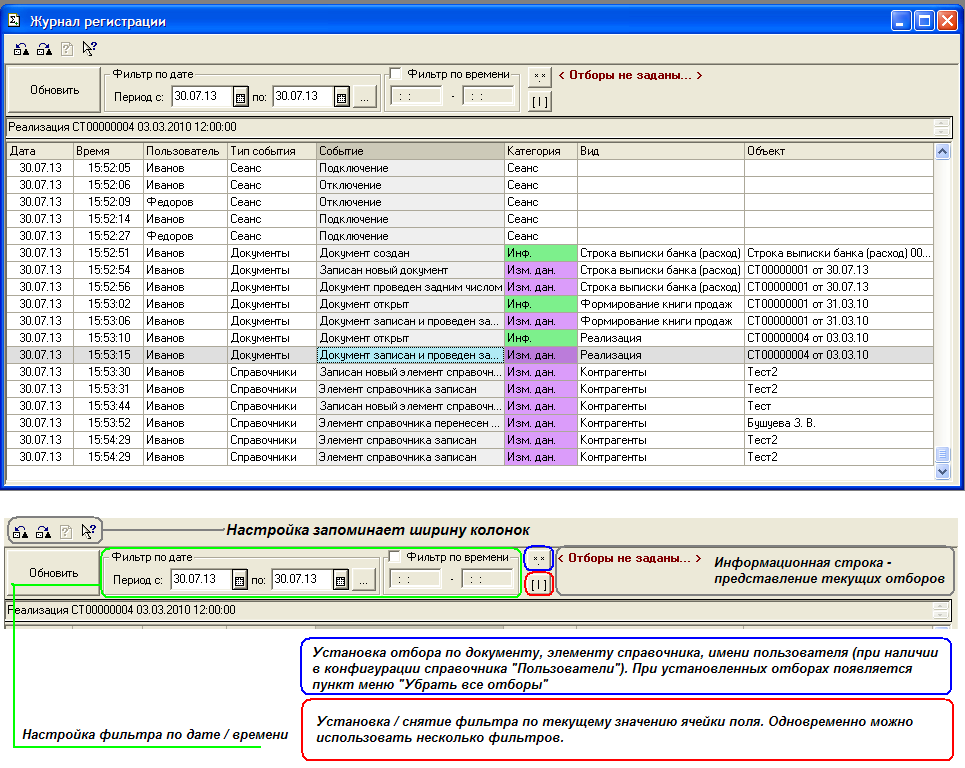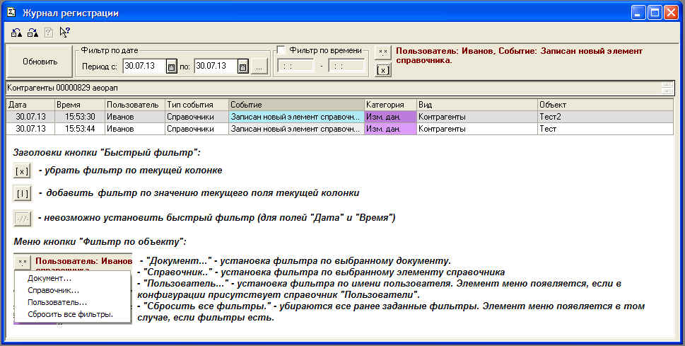 Кроме того, при просмотре журнала очень удобно использовать быстрый фильтр по нескольким значениям (например по пользователю и событию, типа «Ввод нового документа»).