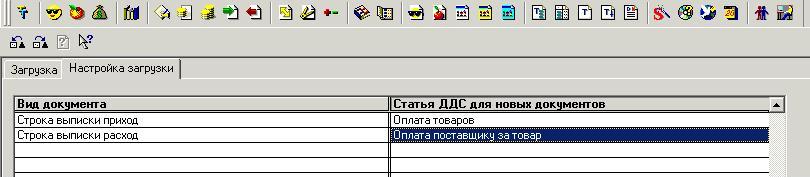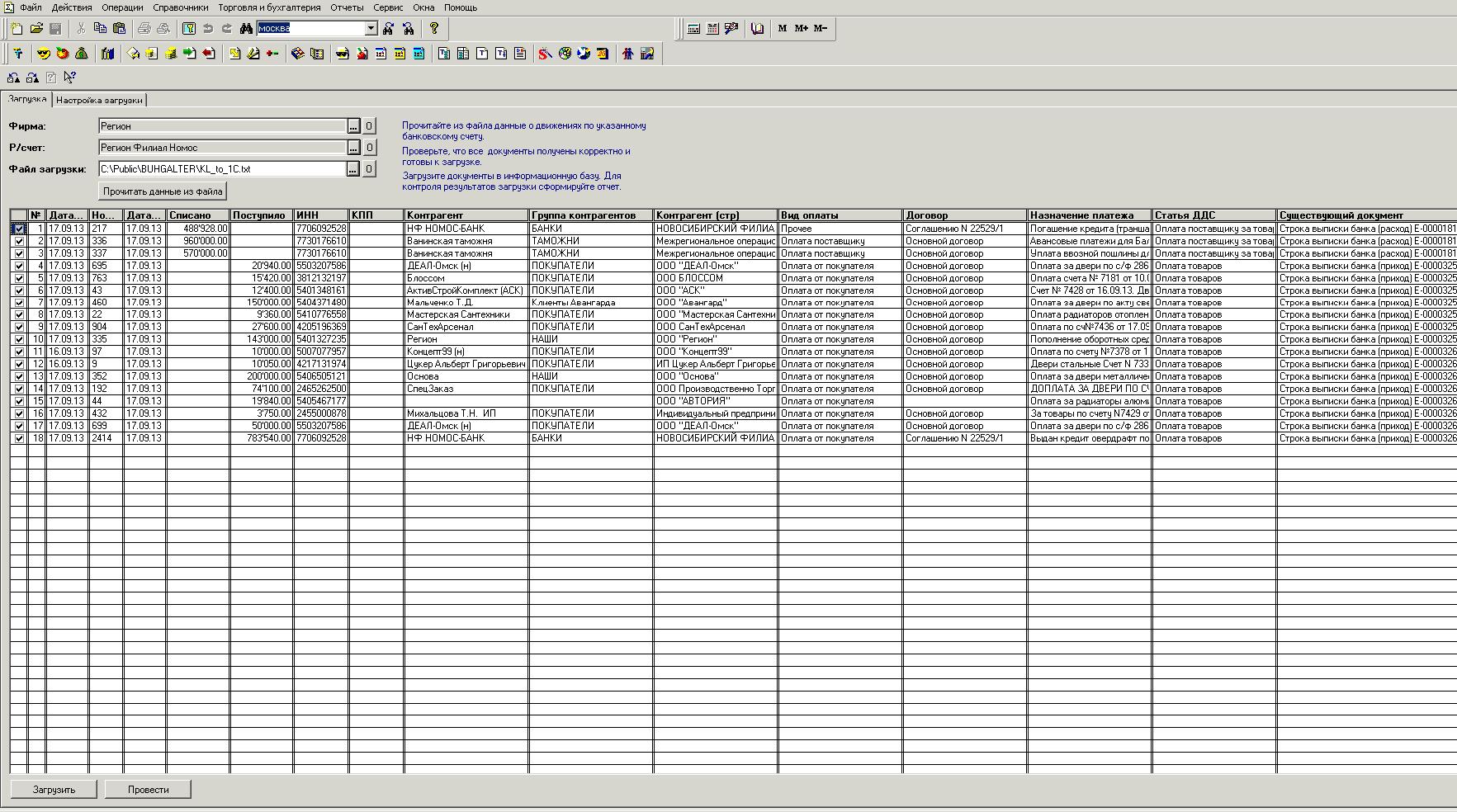 Обработка предназначена для загрузки строк выписок приход и расход без создания платежных поручений из клиент-банка для торговли и комплексной 7.7. По форме обработка напоминает загрузку для 8.2 — тот же выбор фирмы, банковского счета, файла и кнопка «Прочитать данные из файла», при нажатии которой данные из файла загружаются в предварительную таблицу с поиском контрагентов по ИННКПП одним запросом и поиском уже загруженных документов. В таблице можно отредактировать колонки «загрузить» — 1-ая колонка, «контрагент», «договор», «статья ДДС(движение денежных средств)», «существующий документ», «О» — открыть существующий документ, «Х» — очистка найденного или подобранного документа. Все остальные колонки — строковые данные из файла. На закладке «настройка загрузки» можно выбрать статьи ДДС для расхода и прихода по умолчанию (их нужног выбирать до нажатия кнопки «Прочитать данные из файла«). По кнопке «загрузить» создаются или перезаписываются отмеченные флажками строки выписок в одной транзакции. По кнопке «провести» — проводятся не в транзакции.
