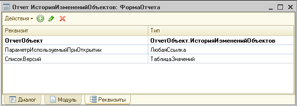 1. Необходимо добавить в форму отчета «История изменений объектов» реквизит формы «ПараметрИспользуемыйПриОткрытии».