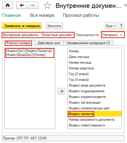 Указываем название нумератора и периодичность. На закладке «Формат номера» можем использовать индекс проекта в номере документов.
