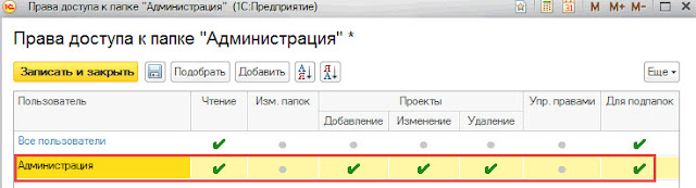 И назначаем права доступа на папку проектов всем пользователям на чтение, а администрации на редактирование.