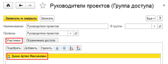 Добавляем в группу доступа «Руководители проектов» на закладке «Участники» всех пользователей или группы пользователей, которые будут ответственными за управление проектами.