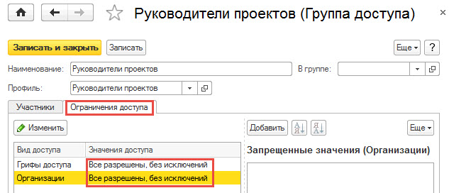 Сразу обратим внимание на закладку «Ограничения доступа». Здесь можно настроить права для участников группы доступа по «Организациям» и «Грифам доступа». По умолчанию, установлены значения «Все разрешены».