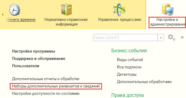 Откроем в разделе «Настройка и администрирование» ссылку «Наборы дополнительных реквизитов и сведений».