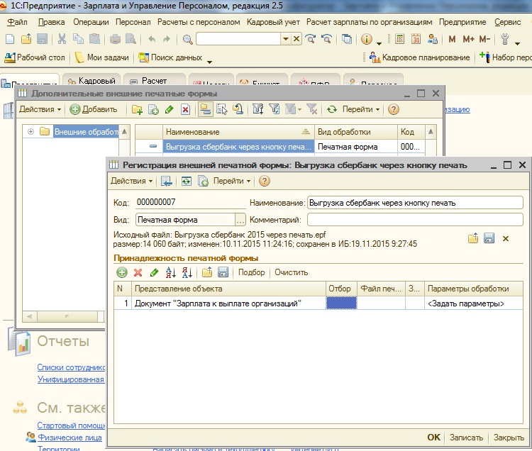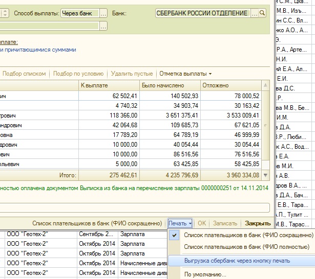 1) Что удобно — НЕ НАДО ОТКРЫВАТЬ Доп.отчеты и обработки, а при формировании документы «Зарпалат к выплате организации», нажимаем кнопку печать, и открывается обработка. И выгружает по текущему документу суммы и реквизиты сотрудников.