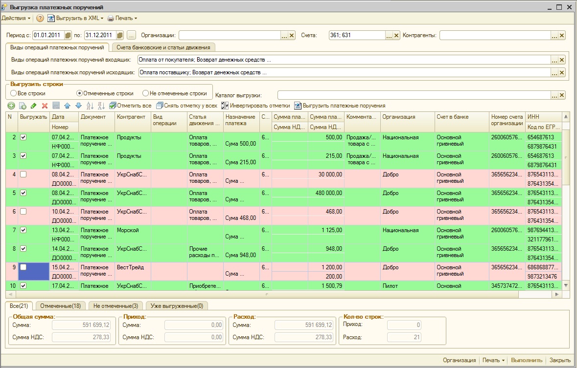 Обработка может выгружать в xml файл либо выводить на печать платежные поручения входящие и исходящие.