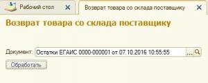 Возврат товара поставщику из остатков на складе ЕГАИС